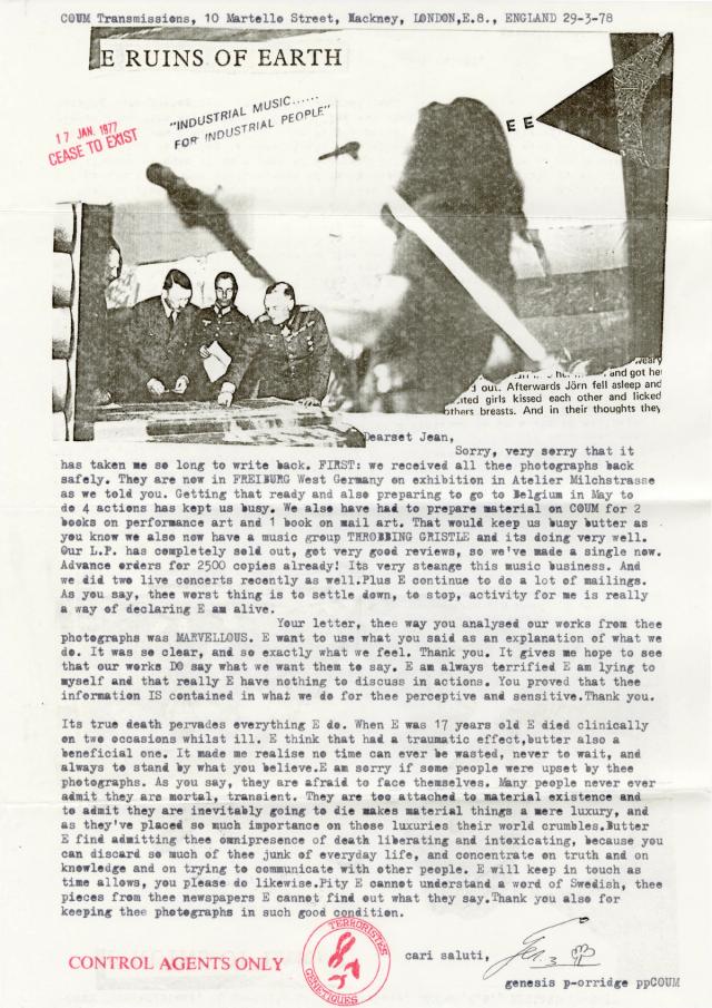 The letter reflects the life and mindset of an artist fully engaged in a variety of artistic activities including performance art (COUM), mail art and music (Throbbing Gristle). P-Orridge apologises for the delay in responding, explaining that they have been busy with various projects, such as an exhibition in Freiburg featuring the same photographs used by Sellem in his St:Petri Gallery exhibition, preparing for performances in Belgium, and contributing to books on performance and mail art. Their band, Throbbing Gristle, is flourishing, with a sold-out album and a new single that has already received 2500 pre-orders. P-Orridge expresses a belief that their constant activity serves a greater purpose, viewing it as a declaration of life. They also convey their appreciation to Jean Sellem for the thoughtful analysis of his work, which reassured them that their art is effectively communicating its intended message.