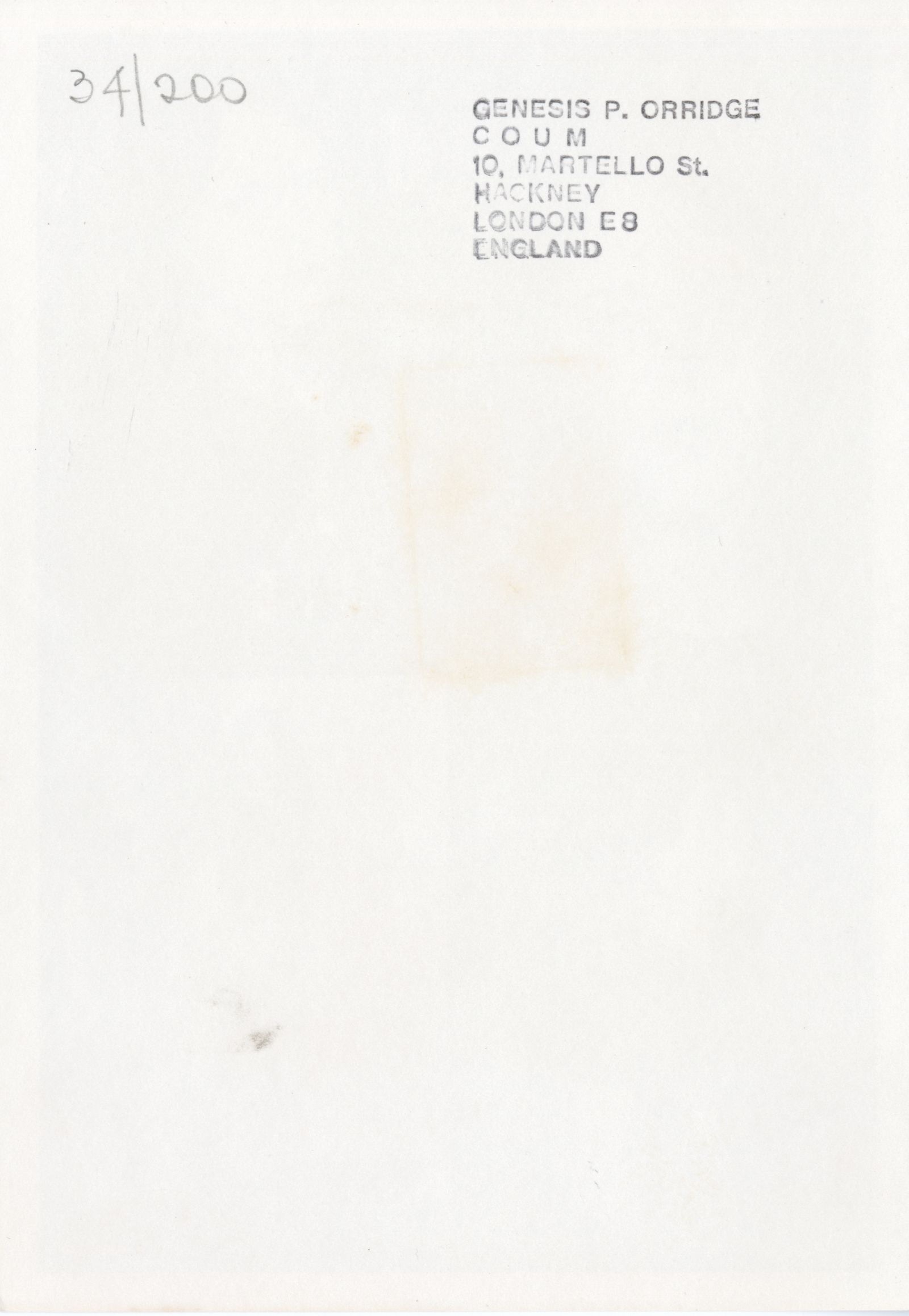 P-Orridge’s contribution to the assembling ‘Libro Internacional. International Book. Livre International (1976) No.1’ organised by Edgardo Vigo. Other contributors included Edgardo Antonio Vigo, Anna Banana, Julien Blaine, Paulo Bruscky, Guillermo Deisler, G.J de Rook, Maurizio Nannucci, Colin Naylor, and many others.