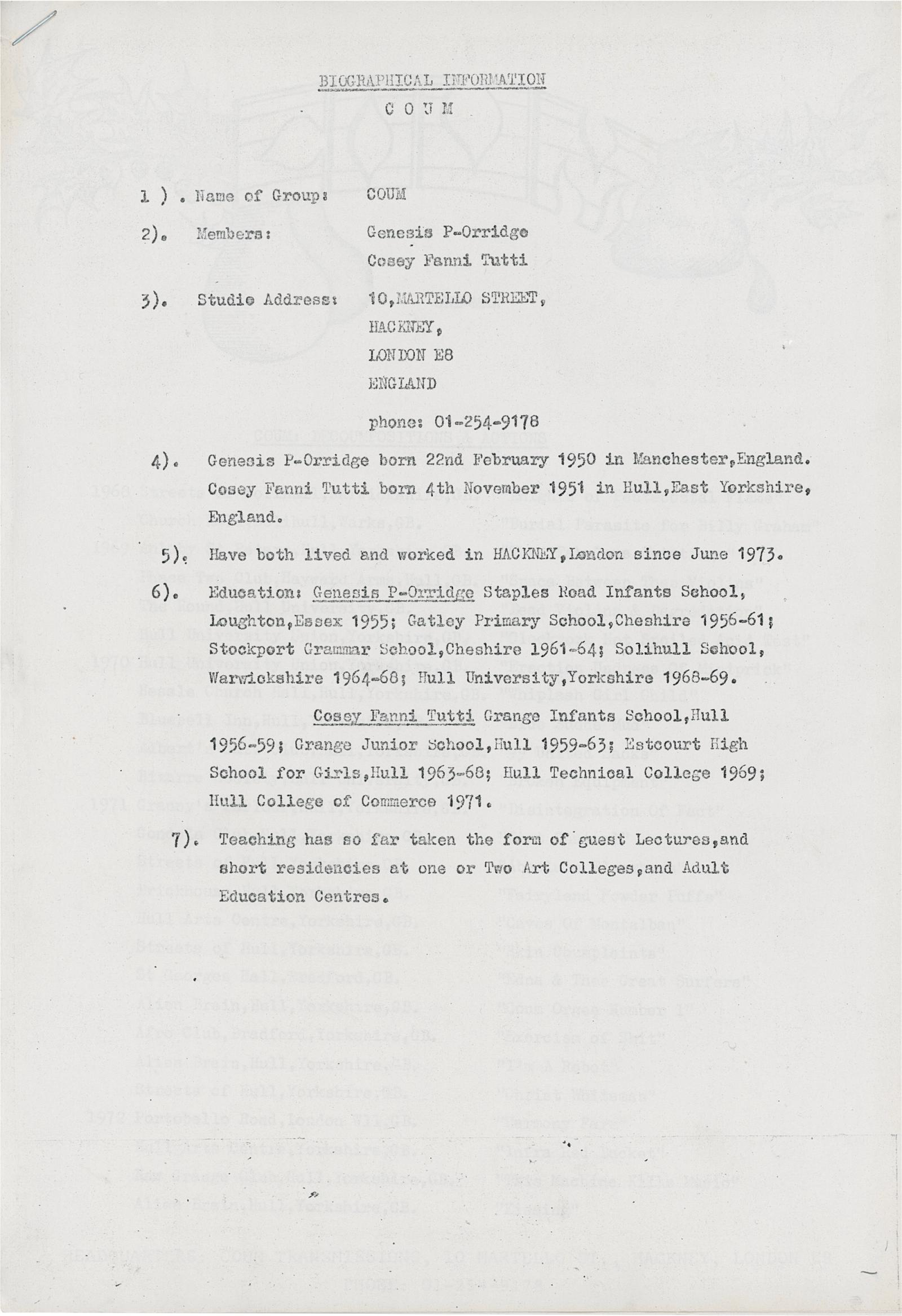 A comprehensive biographical accounting, which includes: a brief biography of Genesis P-Orridge and Cosey Fanni Tutti, a catalogue of actions from 1968 to 1977 with their names and locations, a selection of group exhibitions from 1972 to 1975, a list of collections they are included in, a compilation of publications, a record of television and radio appearances, an inventory of videotapes, an inventory of sound tapes and cassettes, and a list of awards.
