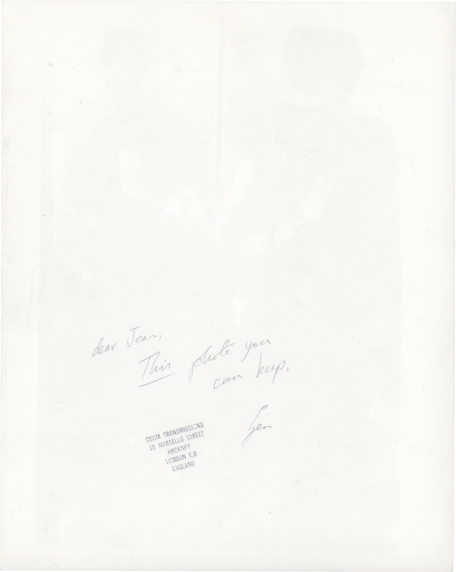 London: COUM Transmissions, Nd. (25.3 × 20.2 cm). Gelatin silver print. Signed by P-Orridge and dedicated to Jean Sellem. COUM Transmissions stamp affixed to the back of the photograph. Number of prints unknown. Rare. Condition: Good. Chemical alteration of silver print. Item ID: 8262.